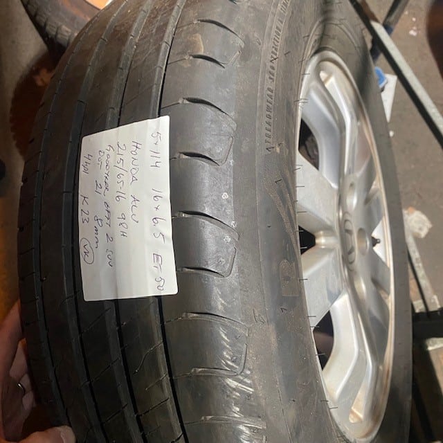 5×114.3 16×6.5 et50 64.1mm käytetty honda aluvanne + 215/65r16 98h goodyear kesät n. 8mm pinnoilla dot21 k23